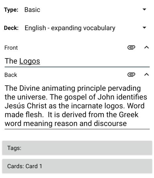 I also remember hearing a Sam Harris podcast where he mentioned he had a penchant for looking up new words in a dictionary and remembering them to enhance his command of the English language. I thought I could do the same thing on my AnkiDroid. I have since created a list of new English words or ideas on my Anki that I want to always keep coming back to. Below is one card example from my current list of English: