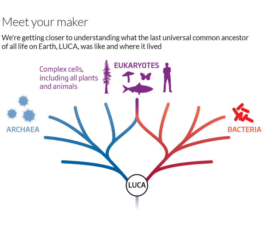 Cerca 3.8 billion years ago there existed the last common ancestor of all life. Single Cell organisms branching to Bacteria or Archaea (another microorganism) which then branch out to form Plantae, Animalia and Fungi. LUCA’s genes metabolized Hydrogen as a source of energy and survive in scorching acidic waters.