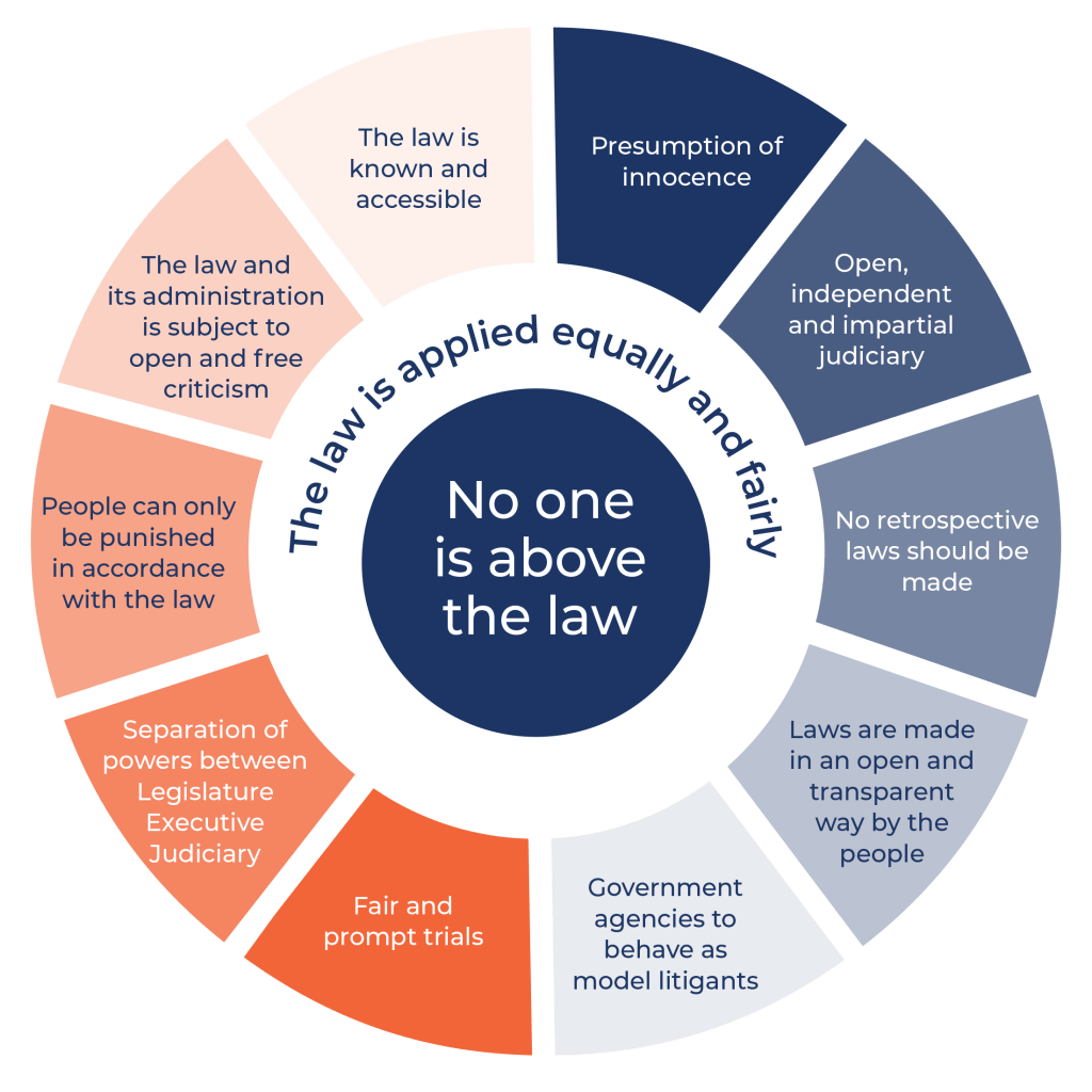 When the authority and influence of law is viewed as a constraint on individual and institutional power. The Rule of Law principle whereby all members of a society are considered equally subject under the law. It’s fundamentally the restriction of the arbitrary exercise of power by subordinating it to well defined and established laws. That no one is above the law. It is the idea that the Government should be based on a system of laws rather than the whims of those in power. All persons are presumed innocent until proven otherwise by a Court. All persons have the right to a fair and prompt trial.