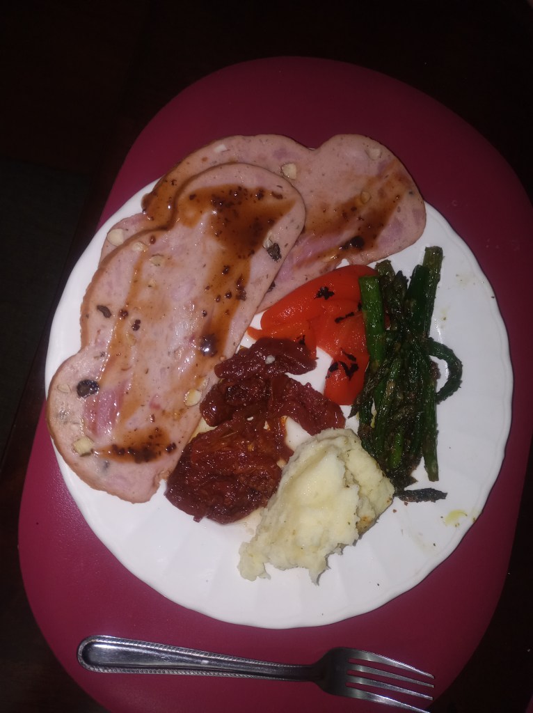 Turkey with plum sauce, Asparagus, Mashed Potatoes, Sun-dried Tomatoes and Capsicum (image inset) and Desert (drum roll) – Chocolate Cake – sugar free but still delicious.