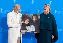 Esmail Mehrabi and Lily Farhadpour from My Favourite Cake with a photo of Maryam Moghaddam and Behtash Sanaeeha, who were not allowed to leave the country (Berlinale 2024)