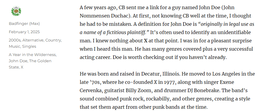 The names John Doe and X sounded familiar, probably because of Max and CB. I like “The Golden State” and agree Doe’s and Kathleen Edwards’s vocals neatly blend.