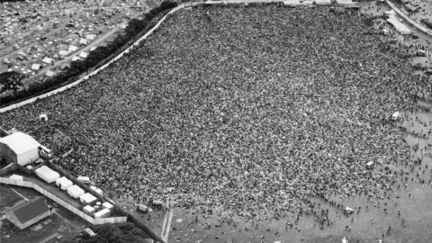 Before the festival, Dylan and his fellow Woodstock residents, the Band, rehearsed at Forelands Farm in Bembridge, and were joined there by George Harrison, the only “outsider” to have visited him in his enclave in the Catskill Mountains. On Saturday, 30 August, the day before Dylan was to take the stage, Harrison’s fellow Beatles John Lennon and Ringo Starr arrived on the island, along with Keith Richards of the Rolling Stones, Eric Clapton and Elton John. Also seated in the sealed-off VIP area in front of the stage would be Beatle wives Pattie Harrison, Yoko Ono and Maureen Starkey.