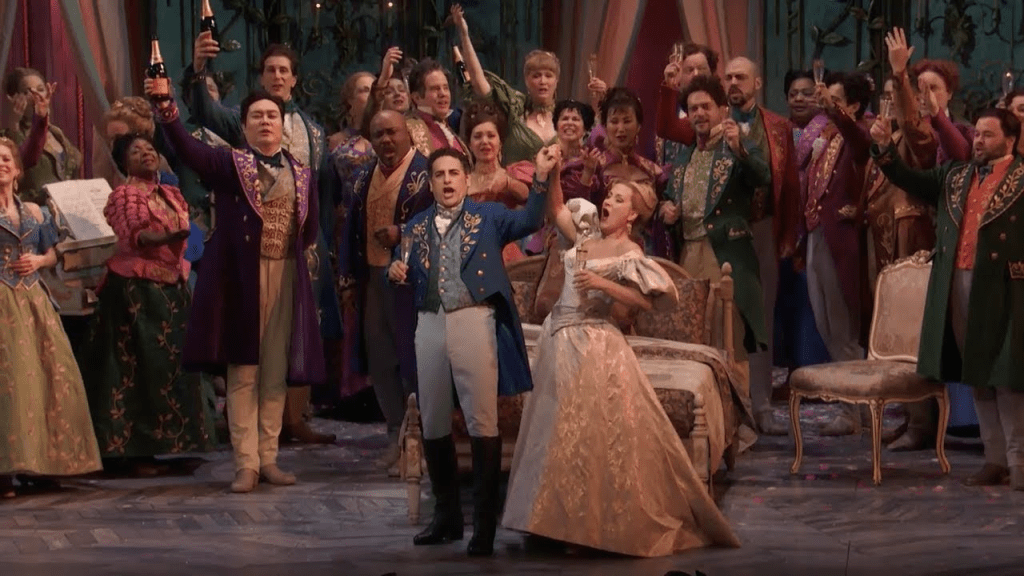 I’ve presented two renditions of the Brindisi (Toast) below. The first comes from the 2018 Metropolitan Opera in New York (with English subtitles), where the set design, costumes, and colours gleam with such elegance and splendour. The second is the beloved version from the mega-popular Three Tenors concert (yes, Plácido Domingo, Luciano Pavarotti, and the other guy), whom I previously featured singing Puccini’s Nessun Dorma (None Shall Sleep). Unsurprisingly, The Drinking song is such a popular performance choice (as is this opera itself) for many great tenors and sopranos.